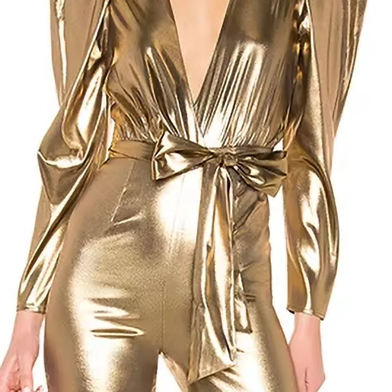 Lady Party Gold Jumpsuit with Belt Deep V-neck Women Sexy or Jumpsuit